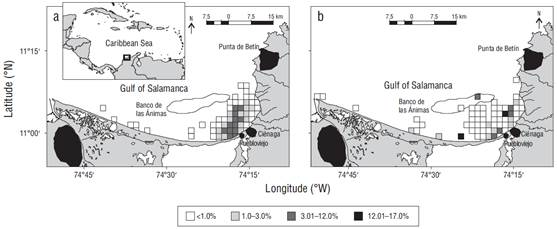 Regarding the spatial distribution of fishing effort, in 2013 the fleet shifted its fishing effort toward the southwestern zone of the GoS (to the east of the mouth of the Magdalena River, in Bocas de Ceniza), contrasting that observed for 2008, when fishing trips were concentrated in areas near the fishing communities. In fact, in comparison with the trend observed for 2008, higher percentages of fishing trips were observed in the western sector of the gulf in 2013 (Fig. 5a, b). Moreover, in 2013 fishing trips were observed near Bocas de Cenizas, a sector that was not exploited in 2008.