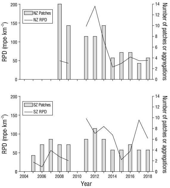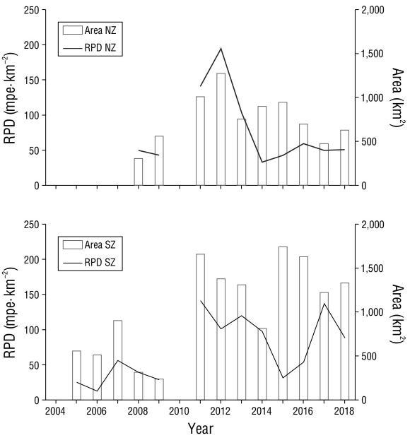 In general, the average area covered by the density of the reproductive potential differed between the northern and southern zones. A greater area was covered in the southern zone (1,045 km2) than in the northern zone (754 km2) (Fig. 3). In addition, in the southern zone, a positive and moderately strong association was observed between the area covered and the density of the reproductive potential, whereas in the northern zone, the relationship was weak or non-existent (estimated Spearman’s rank correlation test, respectively, for each zone: r sSZ = 0.79, P = 0.05; r sNZ = 0.31, P = 0.05).