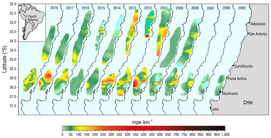 This work aimed to estimate the reproductive potential of the P. monodon female stock in the central-southern zone of Chile (32.0° S-37.0° S) and to evaluate, through maps, its spatial and temporal distribution from 2005 to 2018.