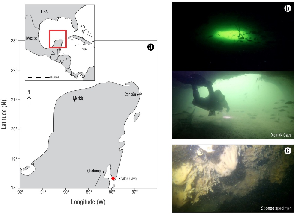 Figure 1 Study site (red diamond) in the Yucatán Peninsula (red rectangle in inset) (a), photographs of anchialine Xcalak Cave (b), and photograph of the sponge specimen (c).