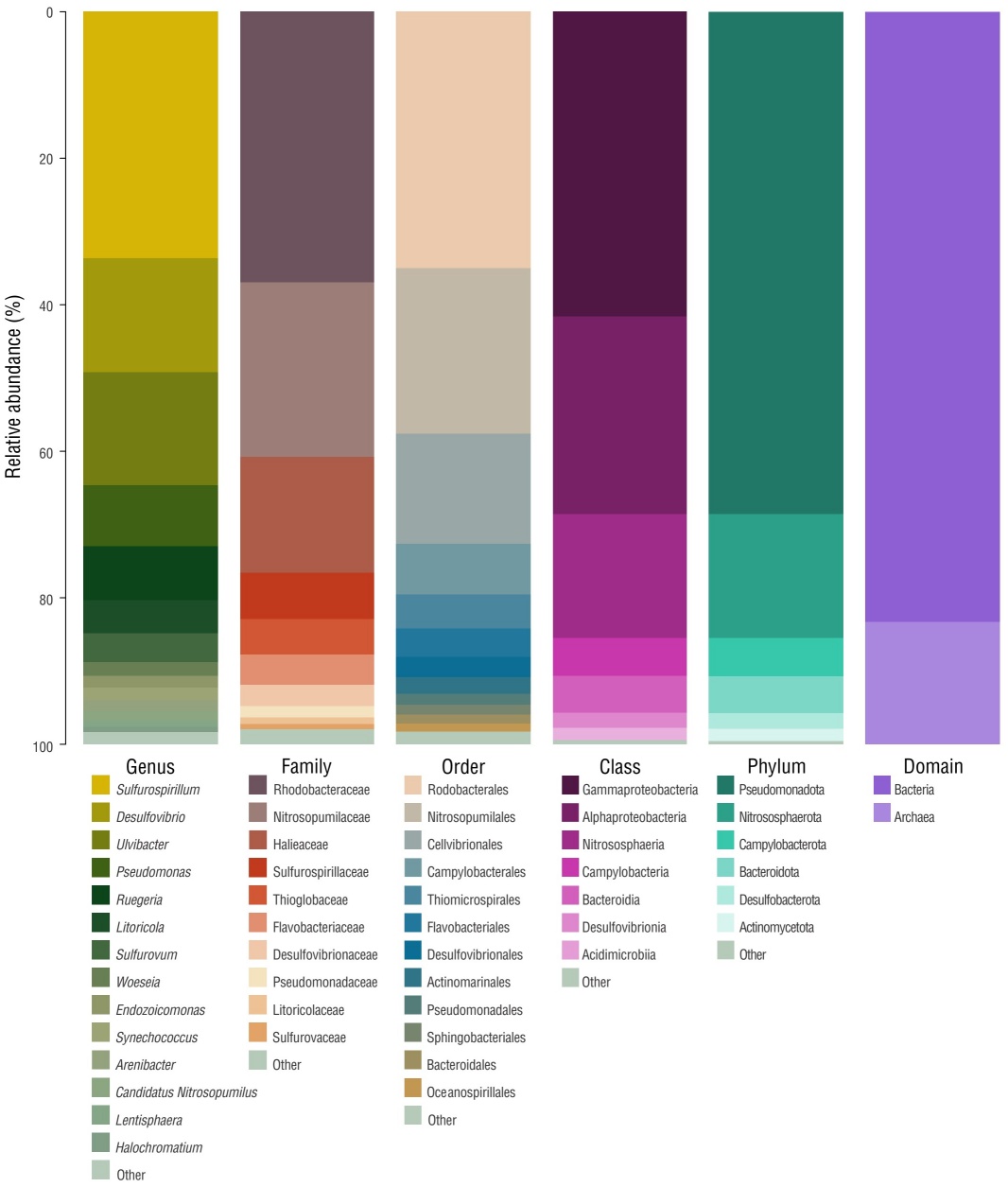 The most abundant phyla (relative abundance) were Pseudomonadota (68%), Campylobacterota (5.2%), Bacteroidota (5.1%), and Desulfobacterota (2.1%) (Fig. 3 and Fig. S2). At the class level, Gammaproteobacteria (41.6%), Alphaproteobacteria (27.0%), and Campylobacteria (5.2%) were the most dominant (Fig. 3 and Fig. S2). Rhodobacterales (35.0%), Cellvibrionales (15.0%), and Campylobacterales (6.9%) were the most abundant orders. The 3 most abundant families were Rhodobacteraceae (36.9%), Halieacea (15.8%), and Sulfurospirillaceae (6.3%) (Fig. 3 and Fig. S2). The genera Sulfurospirillum (33.6%), Desulfovibrio (15.6%), Ulvibacter (15.4%), Pseudomonas (8.4%), and Ruegeria (7.3%) were the most dominant (Fig. 3 and Fig. S2). The only genus identified for Archaea was Nitrosopumilus (Fig. 3 and Fig. S2).