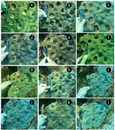 Figure 1 Coral tissue recovery experiment over a 2-year period. Bare area one month after Orbicella faveolata fragments were removed (June 2021) (a). Progress in recovery of damaged tissue in August 2021 (b), October 2021 (c), December 2021 (d), February 2022 (e), April 2022 (f), June 2022 (g), August 2022 (h), October 2022 (i), December 2022 (j), and February 2023 (k), and the recovered area at the end of the study (May 2023) (l).