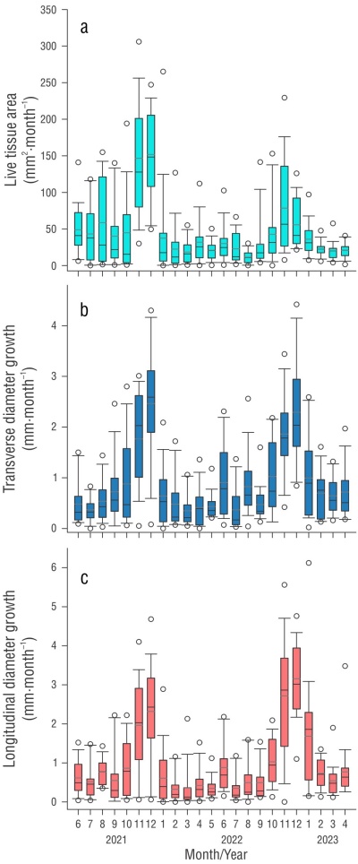 | Month | Real area (mm2·month-1) | Transverse diameter (mm·month-1) | Longitudinal diameter (mm·month-1) | Polyps (N·month-1) | SST (°C) | PAR (µmol quanta·d-1) |
