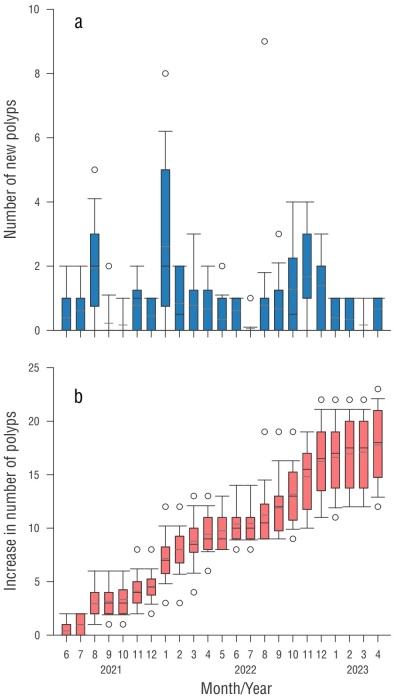 The damaged (donated) area showed a cumulative number of new polyps of 18 after 24 months of monitoring, with an increase of 0.77 ± 0.91 polyps monthly (Tables 1 and 2). The increase in the number of polyps between colonies showed significant differences, and variations were also present in time and in the interaction between colonies × months (Table S1), mainly in the warmer months (August to October) (Fig. 3) when the highest values ocurred.