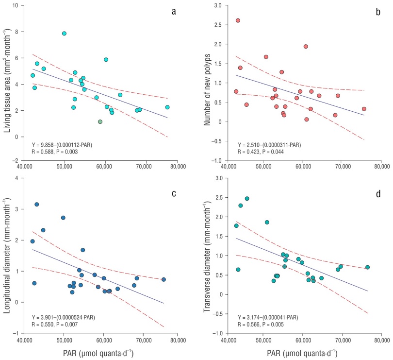 Monthly temperature averaged 28.62 °C (range: 25.95-30.56 °C) (Table 1). The highest temperatures were observed from July to September (~30.32 °C) and the lowest from January to February (~26.21 °C). Light averaged 52,286 µmol quanta·d-1, ranging from 42,145 µmol quanta·d-1 (November) to 60,112 µmol quanta·d-1 (August) (Table 1). The highest light intensity was observed during the month of August, coinciding with the highest temperature values. Linear regression analysis only showed a negative correlation with the PAR factor and all growth parameters (P < 0.005) (Fig. 4).
