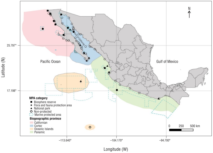 We compiled information on fish presence in 66 sites (21 MPA sites and 45 non-protected sites) along the Mexican Pacific (Fig. 1). The study region was divided into 4 biogeographic provinces according to the regional classification of Robertson and Cramer (2009), which is based on the geographic distribution of shore fish species (i.e., resident species whose abundance or distributions indicate they exhibit self-sustaining populations in the region; Robertson et al. 2004). The Californian province extends north from 25° N along the Pacific coast of the Baja California Peninsula (Robertson and Cramer 2009). It is influenced by the California Current, which imposes its temperate features (average sea surface temperature [SST] of 16 °C; SAGARPA 2018), and the North Equatorial Current and its tropical features (SST of 29.2-25.6 °C; SAGARPA 2018) (Bernal et al. 2001, Valdez and Díaz 1996).