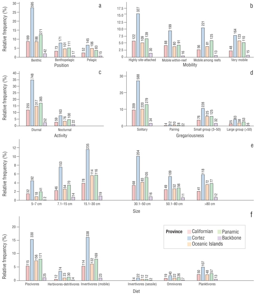 Figure 2 Relative frequency histograms showing the number of species per categories within the considered biological traits: position in the water column (a), mobility (b), period of activity (c), gregariousness (d), maximum size (e), and diet (f). Different columns represent different biogeographic provinces (Californian [red], Cortez [blue], Panamic [green], and Oceanic Islands [orange]) and the regional backbone (purple).