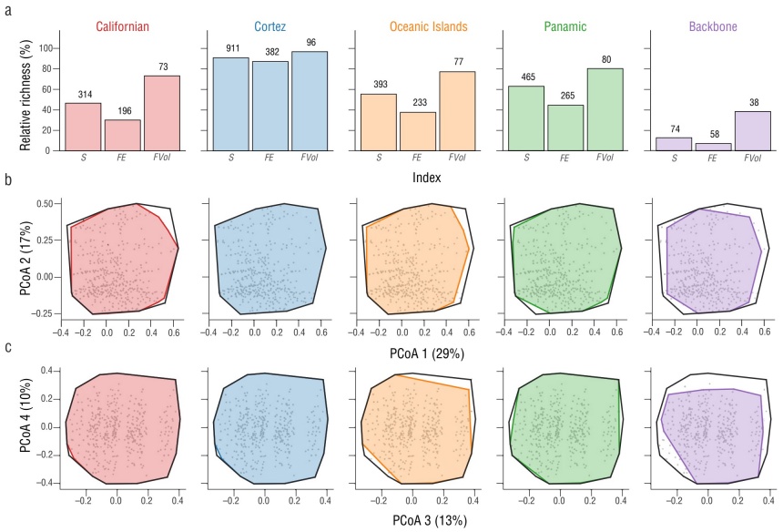 The Cortez province presented the highest fish diversity values (911 species, 382 FEs, and FVol = 96%), followed by the Panamic (465 species, 265 FEs, and FVol = 80%) and Oceanic Islands (393 species, 233 FEs, and FVol = 77%) provinces. The lowest values were observed in the Californian province (314 species, 196 FEs, and FVol = 73%). In comparison, the regional backbone was comprised of 74 species (30% of the total species richness registered in the study area) and 58 FEs, covering 38% of the total regional volume (Fig. 3). These results indicate that the range of “functions” (FVol) was similar between biogeographic provinces despite the differences in S and FE values. Moreover, through the regional backbone description, we identified the fundamental species and, thus, the FEs necessary to maintain reef processes in the Mexican Pacific.