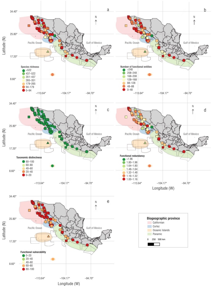Figure 4 Geospatial representation of the ecological indicators calculated with the information of fish species presence and biological traits: species richness (S: total number of species per site) (a), number of functional entities (FE: number of species groups with unique combination of categories for the biological traits) (b), average taxonomic distinctness (Δ+: distance between each pair of species according to the Linnaean classification tree) (c), functional redundancy (RED: average number of species per functional entity) (d), and functional vulnerability (FV: percentage of functional entities [FEs] with only one species) for the 4 biogeographic provinces (colored polygons) within the Mexican Pacific (e). Markers per site indicate the interval scale for each ecological indicator: low (red), medium (yellow and orange), and high (green) values. Gray lines show the protection polygons of marine protection areas (MPAs). Circles indicate non-protected sites; other markers indicate that study sites are located in MPAs with distinct protection categories: national parks (triangles), biosphere reserves (squares), and flora and fauna protected areas (stars).