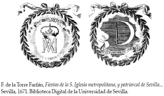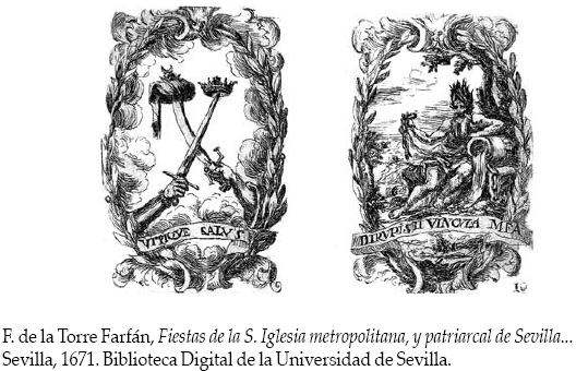 12 F. de la Torre Farfán, Fiestas de la S. Iglesia metropolitana, y patriarcal de Sevilla, al Nveuo Cvlto del señor rey S. Fernando el Tercero de Castilla y de Leon. Concedido A todas las Iglesias de España, por la Santidad de Nuestro Beatíssimo Padre Clemente X. Ofrecelo a la Avgvs-tissima magestad de Don Carlos II. N.S. Rey de las Españas, la misma santa iglesia. Sevilla, 1671. Existen dos ediciones facsímil: la primera es del Fondo de Cultura de Sevilla focus, 1985, con introducción de Antonio Bonet Correa; la segunda es de la Editorial Euringra, La Coruña, 1991, edición al cuidado de Sagrario López Poza con introducción de Santiago Sebastián López. Trascribo en este párrafo parte de mi estudio sobre esta fiesta publicado en Víctor Mínguez, "La iconografía de la fiesta", Andalucía Barroca. Fiesta y simulacro, Junta de Andalucía, 2007, 100-115.