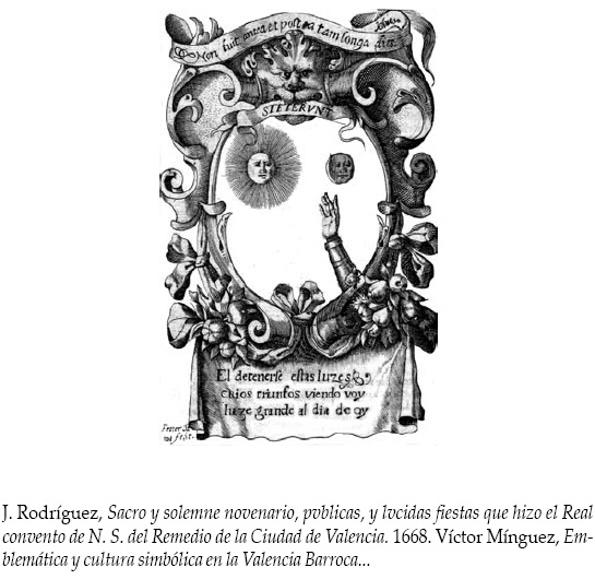 Otro marco de la emblemática festiva valenciana fueron las justas poéticas. La crónica de las fiestas inmaculistas de 1665 describe la celebrada en el convento de San Francisco el 5 de enero: de los siete jeroglíficos presentados al concurso se grabaron cuatro.21 La justa celebrada los días 6 y 10 de mayo de 1667 con motivo de la inauguración de la nueva capilla de la Virgen de los Desamparados contó también con un concurso de jeroglíficos. La crónica reproduce el jeroglífico múltiple diseñado por José Vicente del Olmo, en el que un jeroglífico mayor, representando una fortaleza estrellada englobaba varios menores en los seis baluartes.22 En 1668 se celebraron en el Convento del Remedio de la ciudad Valencia festejos por la declaración de antigua santidad de San Juan de Mata y San Félix de Valois, hecha por el pontífice Alejandro VII.23 El cabildo local convocó con tal motivo un certamen poético en la capilla mayor del convento trinitario el 3 de mayo, incluyendo un concurso de jeroglíficos, de los que se grabaron dos en la relación de fiestas. El primer premio lo consiguió don José Vicente del Olmo, que compuso un emblema presidido por el signo de Géminis, en el que aparecía una tiara solar levitando sobre un templo. De éste partía hacia el arco iris un escudo trinitario alado. El segundo jeroglífico grabado fue diseñado por el presbítero licenciado José Ramírez y constaba de un sol, una luna y un brazo armado haciendo alusión al pasaje bíblico en el que Josué, en el transcurso de una batalla, detiene el Sol en lo alto.