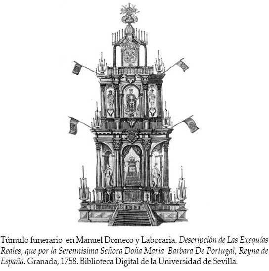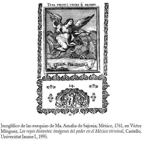 Ya en la temprana fecha de 1559 el catafalco levantado en la capilla de San José de los Naturales del convento de San Francisco de la ciudad de México es adornado con una serie de jeroglíficos, inspirados directamente en Alciato, que sin embargo, no fueron grabados.36 Pero si otras composiciones, como los jeroglíficos ideográficos pintados para la entrada del virrey José Sarmiento de Valladares en la ciudad de Puebla en 1697, diseñados por el mercedario Juan de Bonilla,37 o los más complejos confeccionados para la jura de Fernando VI en México en 1746.38 Sin embargo, casi todos los jeroglíficos mexicanos reproducidos en estampas corresponden a series funerarias diseñadas con motivos de óbitos de los reyes y las reinas de España. Las encontramos en las siguientes relaciones: Isidro Sariñana, Llanto de Occidente, México, 1666; Agustín de Mora, El Sol eclypsado, México, s.a. -con jeroglíficos grabados por Antonio de Castro; José de Villerías, Llanto de las estrellas, 1725; y Carlos Cadena, Descripcion de las Reales Exequias, Nueva Guatemala, 1789 -ilustrada con láminas realizadas por los hermanos Diego y Gonzalo Garci-Aguirre-. Y las crónicas anónimas Llanto de la Fama -con jeroglíficos narrativos grabados por Eligio Morales-, Lagrymas de la Paz, México, 1762, -jeroglíficos grabados por Antonio Moreno-, y Reales Exequias de la Serenissima Señora Da. Ysabel Farnesio, 1767, -decorada con hermosos jeroglíficos pintados por el reputado Miguel Cabrera-.