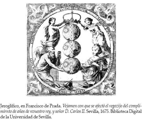 La última gran serie de jeroglíficos grabados producida en la Corte engalanó la iglesia del convento de la Encarnación de Madrid en 1689, con motivo de las exequias de María Luisa de Orleáns, primera esposa de Carlos II.10 De entre los muchos jeroglíficos dispuestos en el atrio, el pórtico, la nave y el presbiterio del templo, cuarenta fueron reproducidos en estampas. Su discurso insiste fundamentalmente en el triunfo sobre la muerte de la reina María Luisa, quizá para contrarrestar la abundancia de calaveras y esqueletos en el túmulo construido por José de Churriguera para esta ocasión. Fueron diseñados en su mayoría por Juan de Vera Tassis y Villarroel, cronista de las honras fúnebres, aunque también participó en su realización el pintor Antonio Palomino.11