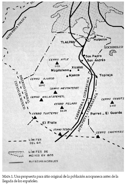 Los modernos pueblos vecinos de Santo Tomás y San Miguel Ajusco están localizados en lo alto de la sierra Ajusco-Chichinauhtzín, a sólo 10 km al sureste de la ciudad de México. A mediados del siglo XV, el tiempo de las grandes conquistas de Axayacatl en el vecino valle de Toluca (1476-1478), Axoxpan colindaba al suroeste con Huitzilahuac, una dependencia de Yaútepec en Cuauhnahuac. Al este colindaba con Malacatepec Momoxco (Milpa Alta), al noreste con Xochimilco y su chinampa, y al oeste con Xalatlauhco (Nepinta-Tuhi, en Matlatzinca, valle de Toluca), una dependencia de Tlacopan.1 Con base en un sondeo de los limites de su territorio mencionados en el título de Ajusco que realicé con las autoridades locales municipales en agosto del 2007, llegué a la conclusión que su asentamiento original bien pudo haberse extendido desde las pendientes del monte Axoxco (o Pelado, 3,600 msnm) al noreste hasta el sureste alrededor del monte Metzontepec. En la época colonial, el pueblo de Santo Tomás Ajusco colindaba al noreste con el altépetl de Coyoacán, al sur con Huitzilac, al este con Xochimilco y Milpa Alta (Malacatepec Momoxco), y al oeste con Xalatlaco.