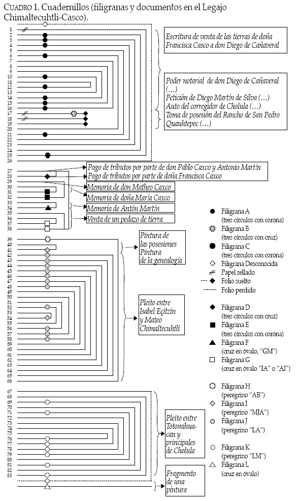 En el Legajo Chimaltecuhtli-Casco, aparecen testamentos, ventas de tierras y pleitos, además de tres pinturas que merecen el calificativo de códices mesoamericanos coloniales. La mayor parte del texto está escrito en castellano, aunque hay algunos fragmentos en náhuatl. El total de folios que lo componen son ochenta y tres, más dos bifolios cosidos entre sí sueltos, donde se encuentra la Tira de Mateo Chimaltecuhtli y Gabriel Ortiz. Respetando el orden en el que aparecen dentro del Legajo, tenemos los siguientes documentos (cuadro 1):