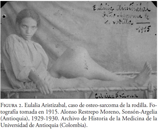 En esta dirección se ubica la colección de fotografías del médico Alonso Restrepo Moreno de pacientes tratados durante su rural7 en los municipios de Sonsón y Argelia (Antioquia). El álbum se ubica entre 1929 y 1930, aunque algunas fotos datan de años anteriores. Entre las primeras fotografías aparece un caso tratado por Restrepo Moreno de un osteo-sarcoma de la rodilla en una joven llamada Eulalia Aristizabal. La foto está fechada en 1915 y clasificada en los casos analizados de clínica externa. Allí aparece Eulalia Aristizabal vestida con una bata blanca y sentada en una camilla, de la cual se sostiene, mirando fijamente a la cámara en un estado de caquexia. Sus dos extremidades se encuentran descubiertas, una recta y otra doblada, esta última exhibe las proporciones colosales del tumor. El fotógrafo captura el rigor extremo del estado patológico en Eulalia, mostrando con ello el orden de la normalidad de los individuos que es preciso alcanzar. En la reproducción que se incluye a continuación se aprecia el efecto de objetividad de la realidad patológica que la fotografía médica pretendía otorgar al ver y al decir médico.8