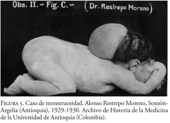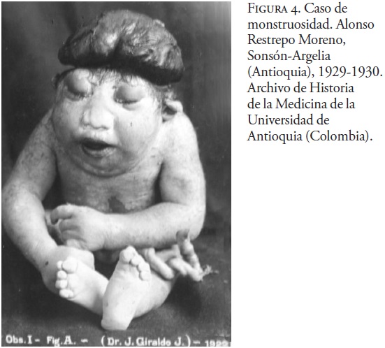 Analicemos ahora cómo esta mirada clínico-teratológica opera en la práctica médica colombiana de finales del siglo XIX y comienzos del XX, donde el acontecimiento monstruoso inquieta la manera de concebir el cuerpo humano a partir del umbral entre lo normal y lo patológico, y cómo esta inquietud deriva en un problema de orden moral, jurídico y clasificatorio. Pero, el acontecimiento monstruoso además de otorgar a los médicos un material de reflexión clínica, las descripciones de casos deformantes y monstruosos son acompañados de imágenes que sirven de apoyo iconográfico al ejercicio de la mirada clínica. Andrea Cuarterolo (2009) dice al respecto que el uso de la fotografía médica cumplió la función, durante el siglo XIX, de exhibir lo diferente, lo potencialmente peligroso en el contexto de una sociedad disciplinaria preocupada por mantener la normalidad tanto física como psicológica.