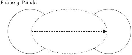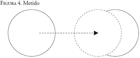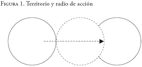 En síntesis, para la esquematización de la conducta social propongo la visualización de un espacio bidimensional (territorio), en el que se identifican espacios individuales y un radio de acción para cada uno de ellos. Así, el contacto entre los individuos es el resultado de la extensión del radio de acción, la que puede implicar ingreso en el espacio ajeno, como se representa en la figura 1.