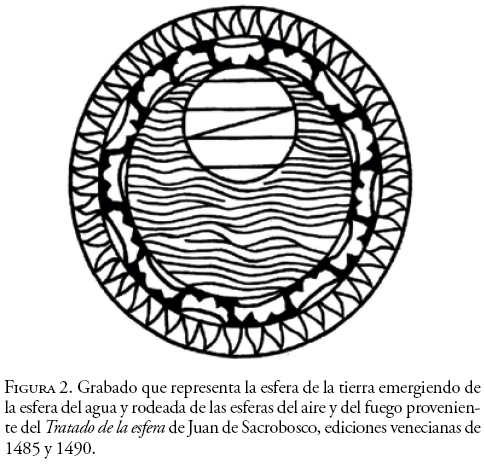A diferencia de las obras propiamente astronómicas, los Tratados de la esfera, no se ocupaban solamente de las posiciones de los astros y las esferas móviles que los transportaban, sino también del mundo sublunar, que era la parte inmóvil de la esfera del mundo y dentro de ello del arduo problema de la integración dentro de ese sistema, de la mecánica de los elementos fundamentales: de ello dependía, en gran medida, la comprensión del lugar de la humanidad misma dentro del orden de la creación. Para acercarnos un poco a lo anterior recordemos, muy resumidamente, que para la física aristotélica los cuatro elementos fundamentales tienden naturalmente a moverse solamente en una dirección precisa, que es el centro del mundo. Es ese movimiento, el de la gravedad, el que explica también que los cuerpos y en este caso, los elementos fundamentales, adquieran naturalmente una forma esférica por ser la única perfecta. Todo, en suma, los compele a ocupar permanentemente el lugar que les corresponde naturalmente en el universo.59 El vacío, recordémoslo también, en la física aristotélica no existe. La noción del locus o lugar natural de los cuerpos está íntimamente ligada con este principio, pues, teóricamente, un cuerpo no puede permanecer en reposo absoluto sino por el hecho de encontrarse en su locus o "lugar" natural, del cual, una vez alcanzado ese estado, tampoco puede separarse, si no es por obra de una "violencia" o fuerza externa. Siendo la tierra el elemento más denso de la naturaleza, ocupa, por ello mismo, el centro del mundo, mientras que el resto de los elementos que le siguen en orden decreciente de densidad, se ordenan concéntricamente respecto del mismo. El "lugar natural", de la esfera del elemento tierra, sería entonces la esfera del elemento que lo contiene, esto es el agua, la cual a su vez tiene su "lugar natural" en la esfera del aire, la del aire en la del fuego y la del fuego en la del ether. Por su parte, este último elemento no estaría finalmente contenido sino por la cúpula exterior del cielo, la cual no está contenida (ni por lo tanto sostenida) por nada, pues nada existe más allá.60