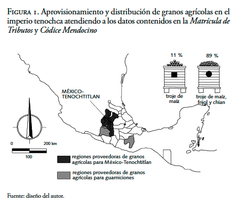 1 Información de 1554: 9.4 millones de kilogramos. Códice Mendocino: 9.2 millones de kilogramos. Las cifras expuestas resultan del cálculo del número de fanegas contenidas en las trojes reportadas en los diferentes registros tributarios del imperio tenochca. Utilizamos la fanega castellana (55.5 litros) propuesta por J. L. de Rojas (1986, 262; 2005).