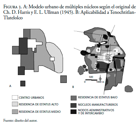 La existencia del precitado sistema de almacenaje con estructura tentacular o dendrítica parece apuntar hacia la presencia de complejas redes de poder heterárquico (Ehrenreich et al., eds., 1995; Bondarenko 2007) en los diversos sectores y distritos urbanos a través de las cuales se vertebraría la administración global del altepetl de México-Tenochtitlan. Este tipo de indicadores proporcionan suficientes indicios para señalar la existencia de un urbanismo de múltiples núcleos o multicéntrico (Harris y Ullman 1945, 7-17; Marcus 2000 [1983], 53-54; Marcus y Sabloff 2009, 8-9) en la capital de los mexicah-tenochcah. Según la moderna sociología urbana, las ciudades organizadas bajo patrones multicéntricos poseen importantes nodos urbanos que concentran elevadas competencias económicas, administrativas y políticas, que favorecen un modelo de descentralización orgánica (Pacione, ed., 2001, 2002). Los costes derivados de los sistemas de transporte también contribuyen a la consolidación de importantes sectores vecinales periféricos al núcleo de la ciudad, puesto que éstos se hallan en condiciones espaciales aventajadas por su proximidad a las fuentes de aprovisionamiento de materias primas, alimentos o mercancías. Es más, a medida que el desarrollo urbano se consolida y los procesos socioeconómicos se vuelven más complejos, dichos sectores y espacios urbanos tenderán a una creciente especialización ocupacional que actuará como catalizador en la atracción de nuevos residentes y trabajadores (Marcus y Sabloff 2009, 9), incrementando, de este modo, su importancia administrativa (Smith y Novic 2012, 5-7) (figura 3).