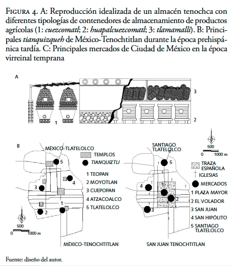 Diversas informaciones históricas y evidencias arqueológicas constatan la existencia de varios focos especializados en el almacenamiento masivo de alimentos y otros productos económicos dentro del espacio urbano de México-Tenochtitlan (figura 2). De este modo se corroboran las observaciones de Francisco Cervantes de Salazar (2005 [1545], libro IV, cap. XV, 363) al comentar que "el modo y manera de recoger las rentas reales era la siguiente: que en México había troxes, graneros y casas en que se encerraba el pan, y un mayordomo mayor [cfr. huey calpixqui, petlacalcatl] con otros menores [cfr. calpixqueh] lo recibían y gastaban por concierto y cuenta de libros de pintura".