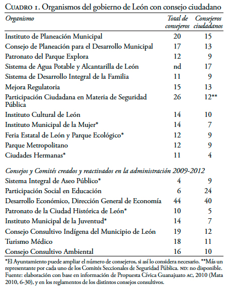 Los mismos comités de colonos se agremiaron en el Consejo Municipal de Colonos, hoy en día el máximo organismo representativo de las colonias, tutelado por el presidente municipal (Gobierno del Estado de Guanajuato 2011a), sumándose así a la larga lista de consejos ciudadanos existentes. A la fecha, los organismos públicos que cuentan con su consejo ciudadano (véase cuadro 1).