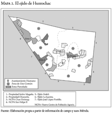 La presente reflexión surge del trabajo de campo que realicé entre el 2009 y el 2012 en cinco ejidos en el centro y sur de Yucatán: Huntochac, situado en el municipio de Oxkutzcab; Chocholá, Maní, Tzucacab y Tahdziu, localizados en los municipios del mismo nombre que cada ejido. A diferencia de estudios etnográficos que se centran en un solo ejido, la observación en cinco ejidos de lo que especialistas consideran una misma región productiva me ha permitido abstraer casos ejemplares que evidencian la diversidad de relaciones de propiedad coexistentes bajo la misma forma de tenencia ejidal en un entorno de políticas de desarrollo rural común y un contexto sociocultural afín.1 Mi trabajo ha consistido en observación participante sobre las relaciones de propiedad practicadas en los ejidos elegidos así como entrevistas en profundidad y semiestructuradas dirigidas a distintos actores entre los que destacan ejidatarios y demás personas con acceso a la tierra ejidal, pero donde también he incluido funcionarios agrarios y promotores del desarrollo rural.