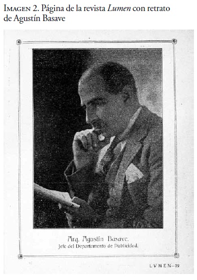Barragán llegó a Nueva York proveniente de una ciudad con una producción alta de publicaciones periódicas. Entre 1919, año en que Barragán ingresó a la escuela profesional, y 1931, cuando visitó Nueva York, en Guadalajara se publicaron al menos ochenta y un revistas con temas que iban desde arte y literatura a deportes y espectáculos, y desde temas religiosos a educación laica.5 Como parte de su preparación profesional, Barragán tomó cursos de arquitectura bajo la dirección del ingeniero Agustín Basave, quien ya había sido su maestro desde el liceo. Según Barragán, Basave "despertó mucha inquietud entre los estudiantes, inquietud por las artes en general [...] entusiasmaba a los estudiantes a escribir o hacia la escritura [...] despertó muchas vocaciones y así fue que yo empecé a interesarme por la parte artística". 6 A través de la figura de Basave, Barragán pudo haberse percatado de la labor publicitaria tapatía. Independientemente de su trabajo como ingeniero si es que éste existió, Basave era jefe del departamento de publicidad de la Compañía Eléctrica Chapala s.a. (cecsa), y como tal publicaba la revista Lumen que la compañía utilizaba, entre otras cosas, para difundir la obra arquitectónica que ésta construía (véase imagen 2).7 Además de su trabajo para cecsa, Basave colaboraba con otras revistas de Guadalajara como la mensual Arte y Artistas, y la bimensual Ibis. Esta última, cuando anunció la publicación del libro Viejos Tiempos escrito por Basave, publicó al igual que Lumen un retrato del ingeniero. En estos retratos ambas revistas difundieron la imagen de Basave deteniendo el objeto del que pareciera representar a su oficio más característico: una publicación (véase imagen 3).8