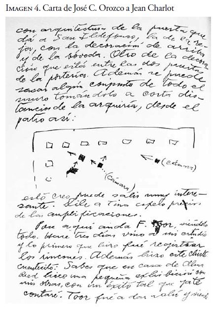 Los Estudios Delphic es el nombre de una galería de Nueva York fundada por la periodista americana Alma Reed creada ex profeso para la promoción del muralista mexicano José Clemente Orozco, también oriundo de Guadalajara.13 La promoción del pintor jalisciense por parte de Reed resaltaba el papel de la arquitectura en aras de encontrar algún arquitecto que contratara la "decoración" de los muros de uno de sus edificios. Aunado a que el medio de las pinturas de Orozco los muros hacía que su campaña de comunicación dependiera de fotografías de la arquitectura portante de sus obras, la "idea arquitectónica" de Reed estimuló a que éste pidiera que la fotografía de su trabajo fuera "90 % arquitectura y sólo 10 % pintura".14 Su preocupación por controlar la imagen de la arquitectura en dichas fotografías era tal que en una ocasión le hizo enviar un plano del edificio de la Escuela Nacional Preparatoria a su colega Jean Charlot para indicar la posición y dirección exacta de la cámara que captaría su obra (véase imagen 4).15 Armada con lo que ella describe como un "portafolio impresionante", Reed visitó las oficinas de los principales arquitectos neoyorquinos aunque sin obtener un trabajo para Orozco de manera inmediata, ya que los arquitectos cuenta Reed concebían de manera muy diferente "los murales en edificios coloniales mexicanos [sic] que en rascacielos de Nueva York".