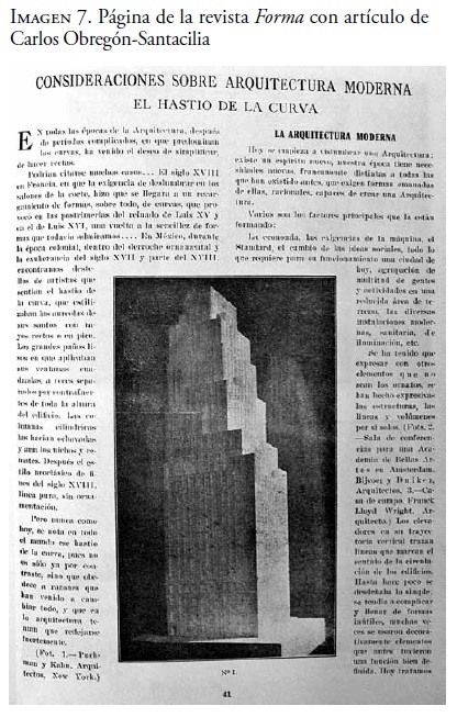 Un año mas tarde, Obregón-Santacilia publicó "Consideraciones sobre la arquitectura moderna: El hastío de la curva", donde propone argumentos derivativos de Le Corbusier y favorece una arquitectura sin ornatos, de líneas y volúmenes expresivos en sí solos, sin elementos "sobrepuestos" y ligados al conjunto como "parte de un todo." Al final del artículo, Obregón-Santacilia incluyó un apartado sobre México donde propuso un proyecto del entonces estudiante Juan O'Gorman como ejemplo positivo. Sintomático de un artículo que menciona las características estéticas generadas por una totalidad compositiva y a diferencia de los artículos sobre Barragán y el escrito por Rivera Obregón-Santacilia ilustra vistas completas de edificios (véase imagen 7). Independientemente del lugar prominente de Obregón-Santacilia en el debate arquitectónico alrededor de la identidad mexicana postrevolucionaria, el último enunciado de su artículo precede la manera en que H&G conceptualizaría la arquitectura de Barragán, esto es, como parte de un movimiento internacional ubicado en México: "muy pronto habrá un verdadero movimiento de arquitectura moderna en México". Es también relevante que Obregón-Santacilia exenta de tradición a la arquitectura moderna en México, algo imposible para alguien quien, como Rivera, integra a su definición de arquitectura mexicana ejemplos arquitectónicos previos del país.