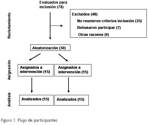 La edad promedio en ambos grupos fue de 46 años, (DS ± 6.4 para el grupo A y ± 5.4 para el B). Todas las pacientes estaban diagnosticadas con dolor en espalda baja por contractura de masas musculares, desempeñaban trabajo administrativo y tenían en promedio tres años de haber presentado el primer episodio de dolor (DS ± 1.1 años grupo A y ± .72 grupo B). El flujo de participantes se presenta en la figura 1.