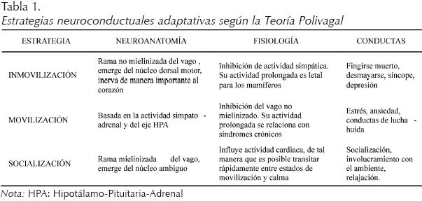 En la Teoría Polivagal (Porges, 2001, 2007) se postula que los organismos enfrentan las demandas del medio utilizando una de tres estrategias neuroconductuales (ver tabla 1), las cuales han sido moldeadas por la evolución. Los organismos superiores, especialmente el hombre, utilizan preferentemente la estrategia más evolucionada llamada de "socialización", sin embargo si esta no le permite recuperar su equilibrio homeostático entonces tenderá a utilizar las anteriores, pasando por estados de estrés y ansiedad hasta llegar a la depresión y la extinción que ésta supone (Porges, 2007; Sapolsky, 2003).