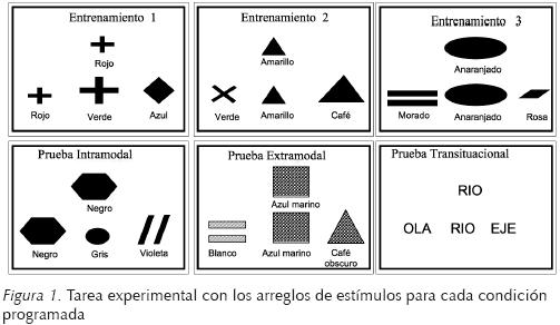 Se utilizó un procedimiento de igualación a la muestra de primer orden, los arreglos de estímulo aparecieron en el monitor de la computadora. En la parte central de la pantalla apareció el estímulo de muestra, y en la parte de bajo tres estímulos de comparación, de entre los cuales el participante debía elegir uno de ellos con base en el criterio de igualación de semejanza. La elección se hacía colocando el cursor sobre el estímulo elegido y haciendo clic con el mouse. Se usaron figuras geométricas con diversos colores, patrones de relleno y tamaños. La Figura 1 muestra un arreglo típico de igualación a la muestra, así como los estímulos utilizados a lo largo las diferentes condiciones.