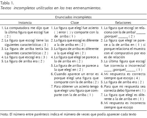 Se utilizaron textos impresos, los cuales contenían una serie de enunciados incompletos mismos que los participantes debían completar. Dichos textos podían hacer referencia a las características físicas de los estímulos (instancias), a la modalidad de los estímulos (clase) o a las relaciones entre los estímulos (relación). Asimismo se emplearon hojas blancas en las cuales los participantes debían escribir la regla que siguieron para ganar puntos (Ver Tabla 1).