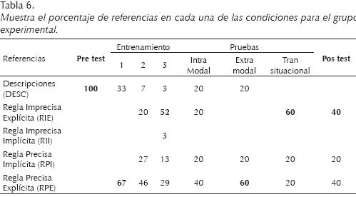 Para este análisis se tomó como medida principal el porcentaje promedio de las referencias emitidas en cada categoría por grupo y por condición. En la Tabla 6 se presentan los porcentajes para el grupo experimental, como puede observarse las referencias en el Pretest fueron en su totalidad de Descripciones (100%), dándose un cambio notable en el Postest, en donde tanto las Reglas Imprecisas Explícitas y las Reglas Precisas Explícitas (RPE) se presentaron con porcentajes iguales (40%), siendo estas últimas las que realmente hacen alusión a la regla general, y con un porcentaje un menor del 20% Reglas Precisas Implícitas (RPI).