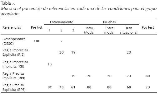 Por otro lado, en los tres entrenamientos se observó que las referencias con mayores porcentajes se concentraron en la categoría de Regla Precisa Explícita (RPE), cuyos porcentajes se ubicaron entre el 61% y 87%, este patrón fue semejante al encontrado en el grupo experimental, aún cuando los porcentajes observados en el Grupo Acoplado fueron superiores, estos porcentajes se mantuvieron en las pruebas de transferencia. Es importante destacar que estos porcentajes se mantienen en las pruebas de transferencia Intramodal (80%) y Extramodal (80%), para decrecer en la Prueba Transituacional (60%). Cabe destacar que la Regla Precisa Explícita (RPE) fue la categoría más compleja para referir una regla.