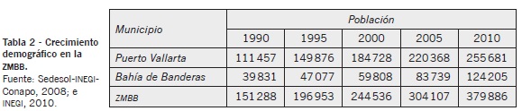 Una particularidad de las ciudades turísticas de México es el rápido crecimiento de la población; en la zona de estudio, el boom demográfico regional se presentó con mayor intensidad en Puerto Vallarta, debido a las altas tasas de migración generadas por la llegada de trabajadores que edificaron la infraestructura turística. Con el tiempo, muchos inmigrantes se asentaron definitivamente, alcanzando una segunda etapa manifestada en la reproducción natural de la población. Así, el número de residentes aumentó más del doble en dos décadas (tabla 2).