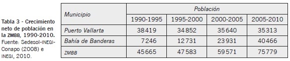 El crecimiento demográfico de Puerto Vallarta impulsaba al de Bahía de Banderas, sin embargo, esta relación se ha venido modificando al asumir éste último municipio un papel más protagónico. Esto se manifiesta en el aumento de 40 466 nuevos habitantes entre 2005 y 2010 superando, por primera vez, a su contraparte jalisciense en el mismo periodo. Así, en veinte años, el crecimiento neto de residentes se ha quintuplicado y la tendencia sigue en aumento. Por lo que respecta al total de la ZMBB, destaca que en los últimos cinco años la expansión se ubica arriba de los setenta y cinco mil pobladores (véase tabla 3).