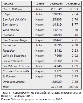 Desde la perspectiva demográfica, Puerto Vallarta concentra los mayores contingentes de población en la zona metropolitana, superiores a los 200 mil habitantes y con más del cincuenta por ciento del total. En el resto de las localidades se observa una fragmentación y dispersión urbana, fortaleciéndose la insularidad sin conexiones eficientes en el espacio conurbado (véase tabla 4).