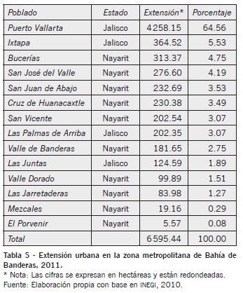 Un elemento a resaltar es la diferencia en el proceso de ocupación entre las poblaciones localizadas en el litoral, de vocación turística, las cuales tienden a ocupar mayor superficie que su contraparte en el interior, cuyas actividades recaen en el sector primario, destacando la agricultura y ganadería particularmente en el Valle de Banderas (véase tabla 5).