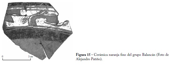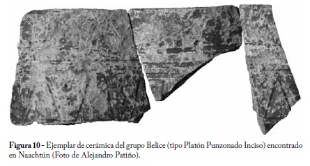 También se observan elementos de continuidad con el complejo anterior en términos de la presencia de los Grupos Tinaja, Belice y Tich', así como con la presencia de vasijas con silueta compuesta con decoración de incisiones y precocción sobre los hombros. Por otra parte, se documentan innovaciones importantes, particularmente la presencia de tipos pertenecientes a los grupos Altar y Balancán originarios del área del bajo Usumacinta (Bishop et al., 2005) (figura 15), el uso de bandas horizontales de 1.0 cm de ancho de engobe sobre la superficie interna de bordes de vasijas monocromas con cuello largo, así como proporciones altas de vasijas con forma de barril con boca restringida, y bordes rectos (observada particularmente entre los grupos Belice y Tinaja).