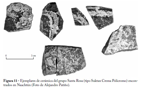 Una innovación significativa la constituye la presencia muy visible de cerámicas originarias de áreas afuera del Petén central. Estos menajes están representados principalmente por vasijas del grupo Chablekal, Belice y Santa Rosa. En lo que respecta al primero, estudios de composición química de pastas de ejemplares de otros sitios utilizando Análisis Instrumental de Activación de Neutrones muestran que estos provienen del área del bajo río Usumacinta (Bishop et al., 2005: 29-31). En Naachtún, ejemplares del grupo Chablekal ocurren como vasijas compuestas trípodes con fondo doble de sonaja con soportes hemisféricos huecos (tipos Telchac Compuesto: variedad Telchac y un tipo no determinado negro sobre gris) (figura 9). La segunda clase (tipos Platón Punzonado Inciso: variedad sin especificar, Gallinero Acanalado y Belice Inciso), posiblemente fue importada de algún centro localizado en el valle del río Belice (Gifford, 1976). La forma más común hallada hasta la fecha en Naachtún la constituyen vasijas con forma de barril, bordes ligeramente incurvados, boca restringida y bases planas (figura 10). Finalmente, las cerámicas del grupo Santa Rosa (Suktán Crema Polícromo: variedad sin especificar) se caracterizan por el uso de decoración policroma aplicada en reserva sobre una base crema en recipientes con paredes rectodivergentes y bordes directos y recipientes cilíndricos (figura 11). Materiales particularmente comunes en la zona del río Usumacinta controlada por el sitio Piedras Negras, la cual parece ser su punto de origen (Golden et al., 2008: 262; Muñoz, 2004).