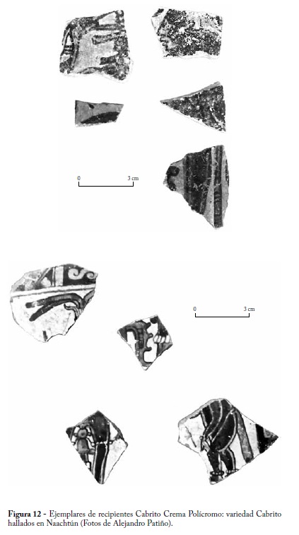 En Naachtún, ejemplares de Cabrito Crema Policromo hallados en excavaciones realizadas en 2010 y 2014, aparecen en depósitos que incluyen materiales Gris Fino, o precedidos por rellenos con estas cerámicas, lo que refuerza la propuesta de una fecha dentro de la segunda mitad del siglo VIII d.C. Esta observación presenta un alto nivel de correspondencia con la cronología propuesta para el "estilo Holmul" por Looper, Reents-Budet y Bishop entre 675 y 750 d.C (Looper et al., 2009). En el transcurso de las excavaciones realizadas este año en el Patio 22 del Grupo B de Naachtún, se recogieron fragmentos de dos ejemplares con diferencias notables en términos de la calidad de la superficie y la ejecución de los diseños de ambos vasos (figura 12). El ejemplar con ejecución más virtuosa y cuidada presenta una serie de elementos distintivos que incluyen una banda celeste, las caderas y las piernas del Dios del Maíz representadas de frente y un enano (figura 12b). Estos son diagnósticos de vasijas cilíndricas producidas para consumo de la corte real de Naranjo, particularmente para uso de un individuo aludido en textos conocidos en dichos vasos como "El del Pedernal" (He of the Flint) (Reents-Budet et al., 1994: 184), identificado por Martin y Grube (2008: 80-81) como K'ahk' Ukalaw Chan Chaak, quien accede como gobernante de Naranjo en 755 d.C. El segundo ejemplar es similar a cerámicas reportadas para los remanentes de un taller cerámico en el sitio de Buenavista del Cayo, asociado a un palacio de élite agrupado políticamente a Naranjo durante los siglos VII y VIII d.C. y que produjo vasos cilíndricos "estilo Holmul" para élites menores, los cuales se caracterizan por su menor calidad de ejecución (Reents-Budet et al., 1994: 184-185; Reents-Budet et al., 2000, figura 24). La presencia de ambos tipos de vasijas en Naachtún sugiere afiliación a las redes de alianza establecidas entre la realeza de Naranjo y otras élites.