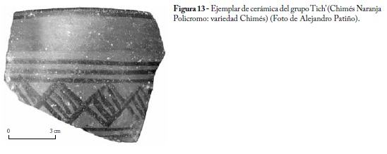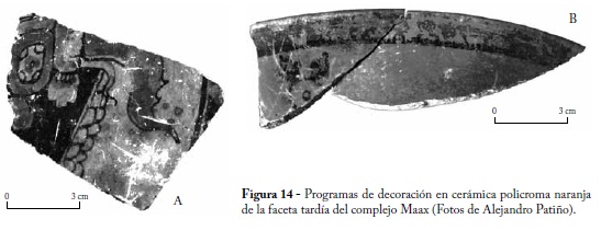 En lo que concierne a cerámicas policromas, se observa en la faceta del Complejo Maax la presencia de cerámicas crema policromas del grupo Zacatal, aunque estas ocurren en proporciones significativamente bajas (Patiño, 2011: 103-105). Cabe destacar, entre éstas, ejemplares del llamado "Estilo Holmul" (tipo Cabrito Crema Policromo: variedad Cabrito) provenientes de Naranjo o de centros de producción asociados a este sitio, tales como Buenavista del Cayo (Reents-Budet et al., 2000) (figura 12). Asimismo, aparecen vasijas anaranjadas policromas con silueta compuesta, borde directo o ligeramente curvado hacia adentro y base anular o recipientes hemisféricos pertenecientes al Grupo Tich' (Boucher y Palomo, 1989: 507-509), caracterizadas por presentar acabados mucho más opacos que los del grupo Palmar, así como la aplicación de capas irregulares de engobe dejadas por trazos de brochazos (figura 13). Otro conjunto importante lo constituye el grupo Chunhuitz (representados por Anonal Policromo y un tipo policromo anaranjado no determinado), aunque este material ocurre en proporciones bajas y se concentra en áreas muy específicas del sitio. Vínculos con el centro del Petén están indicados por la presencia de un diseño consistente en un círculo con cuatro "pétalos" equidistantes en negro en vasijas anaranjadas policromas (tipo: Palmar Naranja Policromo) (figura 14b). Este motivo ha sido documentado hacia finales del siglo VIII d.C. en Tikal, Naranjo y Nakum (Herring 1995/1996: 35, 39-40). Asimismo, se observan diseños de "cruz de Kan" en vasijas naranja policromas dibujados como elementos individuales, así como partes de figuras más complejas (figura 14a). Estos aparecen en otras regiones del Petén entre la segunda mitad del siglo VII y la primera del VIII d.C. (Reents-Budet, 1994: 20, 330, figura 36).
