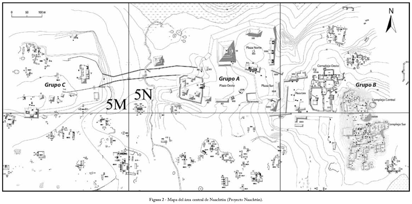 Naachtún se encuentra localizado en el área noreste del Departamento del Petén, Guatemala (figura 1). En términos generales, los grupos arquitectónicos que componen el centro del sitio están dispuestos siguiendo un eje este-oeste sobre un afloramiento cárstico que bordea un bajo (figura 2). Los principales grupos se identifican como Grupo C, Grupo A, y Grupo B, dispuestos en un eje oriente-occidente en ese mismo orden. El primero, está constituido por un conjunto triádico de pequeñas dimensiones y una serie de plataformas alargadas. El segundo, comprende la plaza principal del centro (Plaza Norte) y una serie de pirámides que conforman lo que parece ser el Grupo E que incluye el templo principal del sitio (Estructura XX). Finalmente, el Grupo B está constituido por un sistema de estructuras alargadas y cuartos dispuestos alrededor de plazas. Hacia el sur de este alineamiento de grupos hay varios conjuntos de patios y estructuras. Los elementos arquitectónicos que componen todos estos grupos y otros conjuntos incluyen rellenos de construcción, basureros y otras clases de depósitos que incluyen, entre otras clases de artefactos, materiales cerámicos. A continuación presento la información actual concerniente a estos últimos.