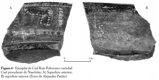 También, se aprecia la presencia ininterrumpida de Caal Rojo Policromo: variedad Caal, el cual constituye un material posiblemente importado de Río Azul (figura 4). Otra innovación importante es la aparición de recipientes policromos anaranjados hemisféricos con bordes ligeramente curvados hacia adentro con bases anulares o fondos planos pertenecientes al Grupo Saxché.