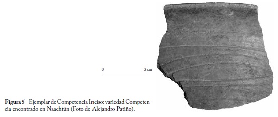 Una característica importante de los menajes de la faceta intermedia es la presencia de tipos y grupos cerámicos que pueden ser asociados en origen a un sitio particular, aunque estos constituyen un conjunto relativamente pequeño. Dichos materiales están representados por vasijas de reborde y pestaña basal, lados rectodivergentes, fondos cóncavos y bases anulares del tipo Caal Rojo Policromo: variedad Caal (figura 4). Éste es reportado inicialmente en el sitio Río Azul (Adams, 1999: 86) y muy posiblemente es originario de allí como lo indica la alta frecuencia de esta cerámica en colecciones procedentes de dicho sitio (Patiño, observación personal en la colección de la ceromática del Instituto de Antropología e Historia de Guatemala, 2008). Un elemento adicional que corrobora, en parte, esta observación, es un tiesto del Grupo Ratones (tipo Competencia Inciso: variedad Competencia) recogido en los remanentes de una sepultura saqueada en 2011 (Patiño, 2013: 206) (figura 5). Dicho material se ha documentado en depósitos de élites asociadas a Teotihuacán a lo largo de las tierras bajas (Iglesias, 2003: 186). Este material se asemeja a vasijas producidas en Puebla durante el periodo de dominación de Teotihuacán en dicha región (Rattray, 2001: 93-95). Sin embargo, el hecho de contar únicamente con un solo caso (n=1) en Naachtún indica que esta tendencia y sentido de afiliación fueron muy restringidos entre la población de este centro.
