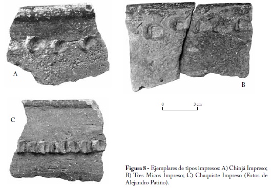 Conjuntos de cerámicas sin engobe con forma hemisférica fondo plano y jarras con cuerpo hemisférico, cuellos largos y cortos y bordes ligeramente curvados o doblados hacia afuera (usualmente con el doblez generalmente abarcando una longitud de 2.0 cm o más) y labios puntiagudos o redondeados también presentes. Otras categorías importantes son las vasijas globulares con fondo plano, bordes gruesos ligeramente curvados hacia adentro, bocas ligeramente restringidas, capas gruesas de engobe negro o negro moteado aplicadas sobre las superficies internas y la parte superior externa del borde, hileras horizontales de impresiones incisas de dedos sobre la superficie exterior del hombro, por lo general próximo y encima de un registro sin engobe (tipos cerámicos Tres Micos Impreso, Chinjá Impreso y Chaquiste Impreso, figura 8), este último muy escaso y exclusivo de la faceta tardía del Complejo Maax. También se observan recipientes con boca restringida, cuerpo globular, cuello alto y bordes ligeramente curvados hacia afuera con estampado o impresiones pequeñas colocadas alrededor del cuello (clasificadas dentro del tipo Pantano Impreso, variedades Pantano y Estampada); vasijas con silueta compuesta, particularmente entre tipos monocromos negros y negros moteados. Un elemento particular de la faceta tardía del Complejo Maax es la presencia de acabados jabonosos logrados a partir de la aplicación de capas gruesas de engobe sobre la superficie de las vasijas, aunque estos constituyen un porcentaje muy pequeño dentro del inventario de materiales pertenecientes a la faceta tardía del este complejo.