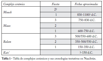 La información concerniente a la cerámica de Naachtún que presentamos está basada en los trabajos de Forné y Patiño (2013), Martínez y Forné (2014) y Patiño, (2011 y 2013). Incluyo también información reciente recabada durante la temporada de campo del 2014, así como su análisis y actualizaciones hechas al esquema de la secuencia cerámica que se viene desarrollando desde 2010. En términos generales, la secuencia cerámica de este sitio se divide actualmente en cuatro complejos cerámicos (tabla 1). Nos enfocaremos en la información concerniente a los complejos y facetas relativamente mejor definidos y entendidos en la actualidad en Naachtún, como Kuts' (ubicado temporalmente dentro del periodo Preclásico Tardío: 300 a.C.-150 d.C.), Balam y sus facetas temprana, intermedia y tardía (periodo Clásico Temprano: 150/200 d.C.-600 d.C.), la faceta tardía del Complejo Maax (Clásico Tardío: 600-800 d.C.) y el Complejo Muuch (Clásico Terminal: 800-950 d.C.) y sus facetas. Dejo afuera de la discusión la evidencia sobre las facetas tempranas e intermedias del Complejo Maax debido a la limitada evidencia concerniente a éstas. Asimismo, no hay por el momento evidencia de cerámica del Preclásico Medio en Naachtún, de modo que no se discute aquí dicho tema.